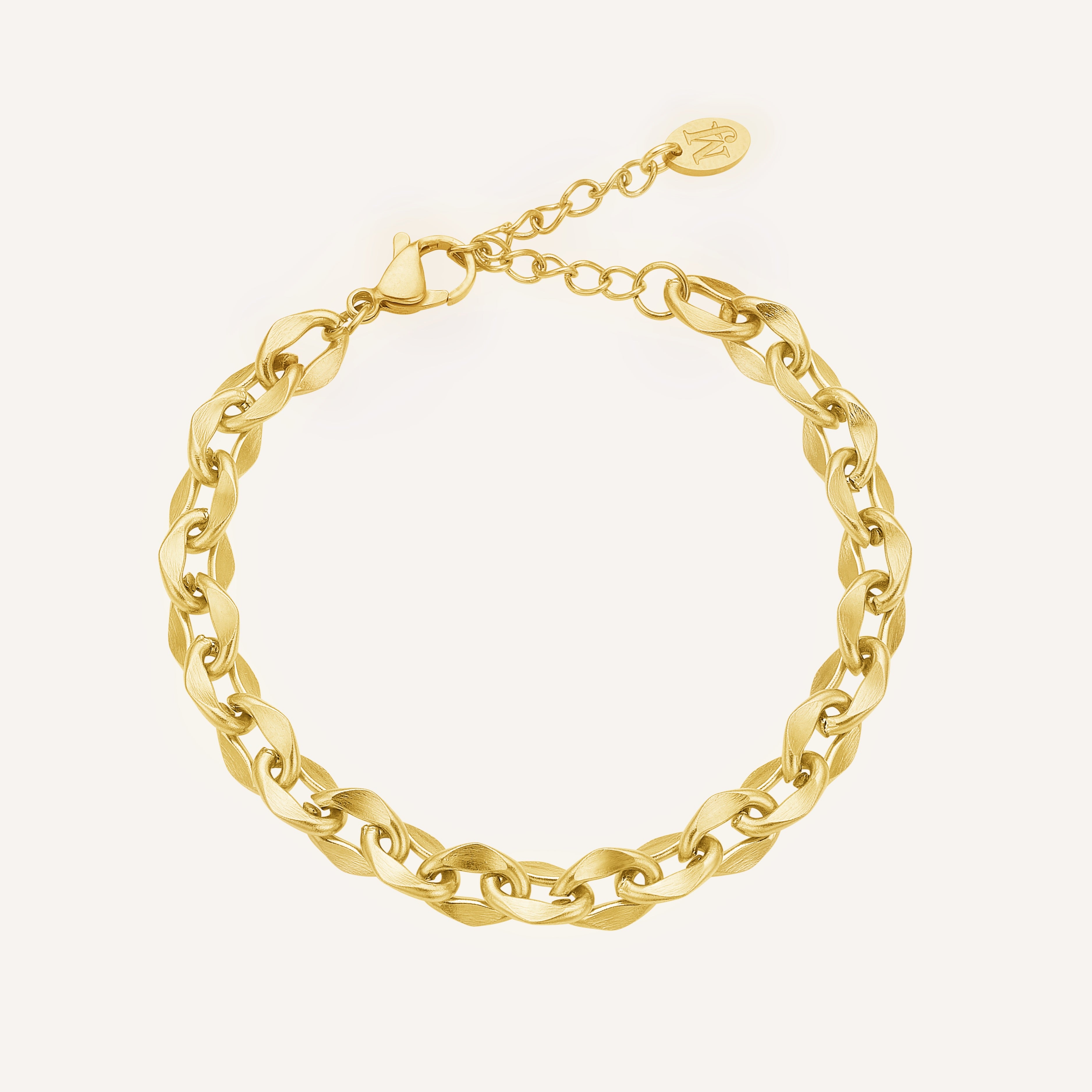 Poleret rustfrit stål, belagt med 18 karat guld + e-coating. Smykkerne er nikkelfri og blyfri, jvf. dansk lovgivning. Smykket kan tåle vand, sved og parfume.