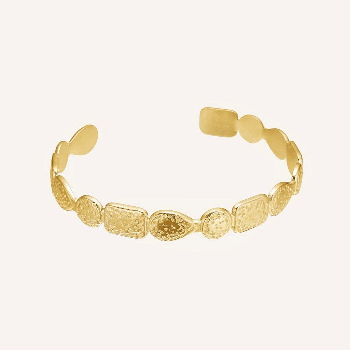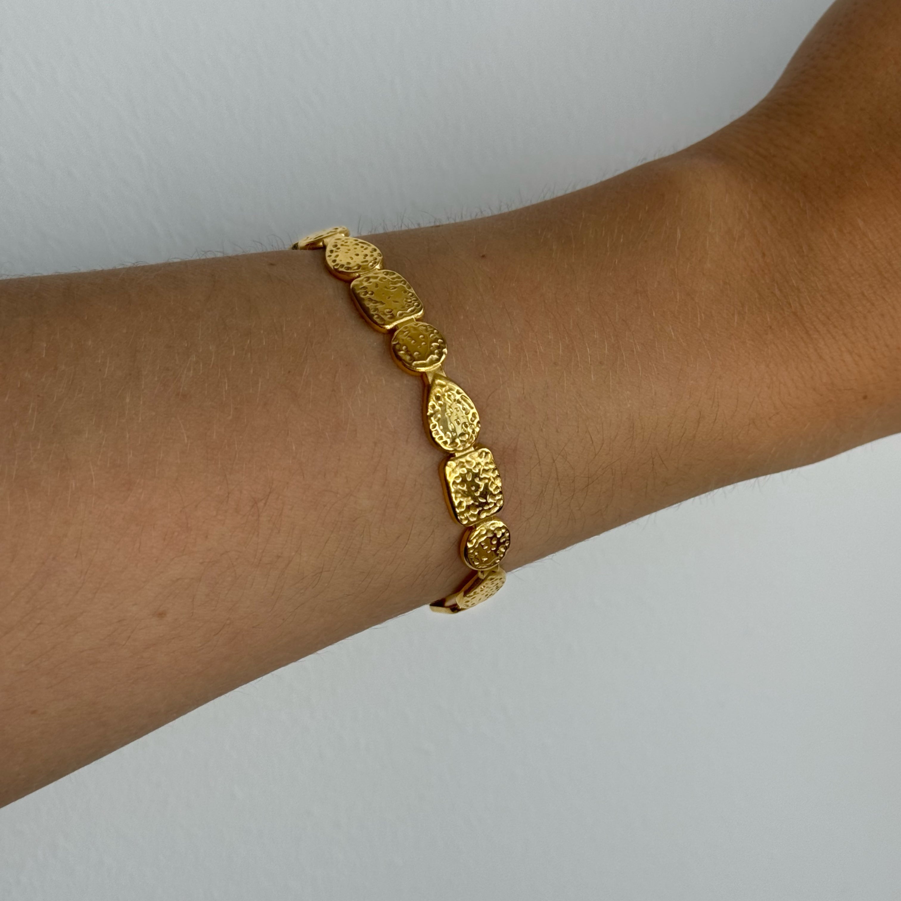 Poleret rustfrit stål, belagt med 18 karat guld + e-coating. Smykkerne er nikkelfri og blyfri, jvf. dansk lovgivning. Smykket kan tåle vand, sved og parfume.