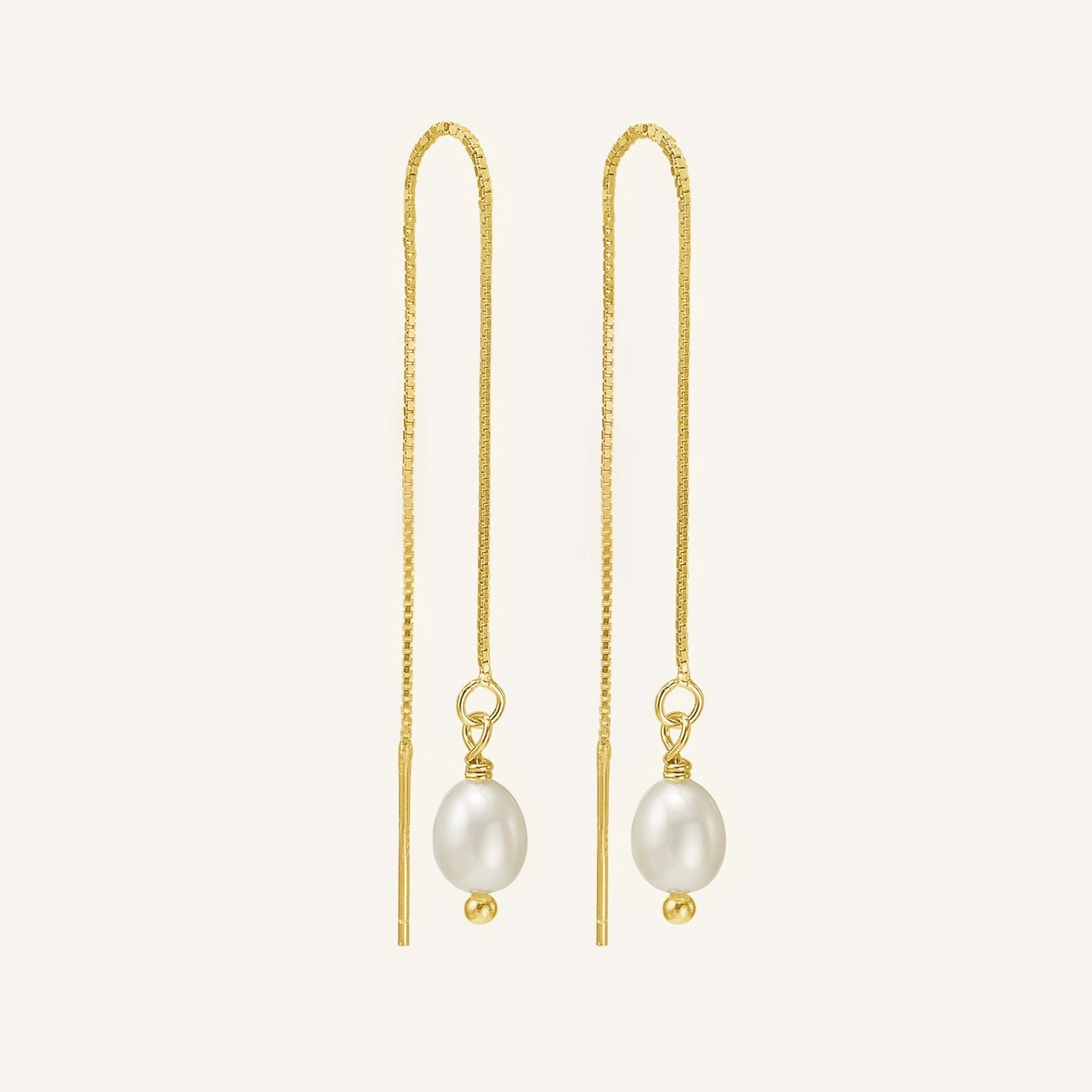 Øreringene er en klassisk skønhed fortolket på eventyrlig vis, hvor en ferskvandsperle falder fra en elegant kæde, der forbinder de to elementer. Udtrykket er delikat og simpelt.