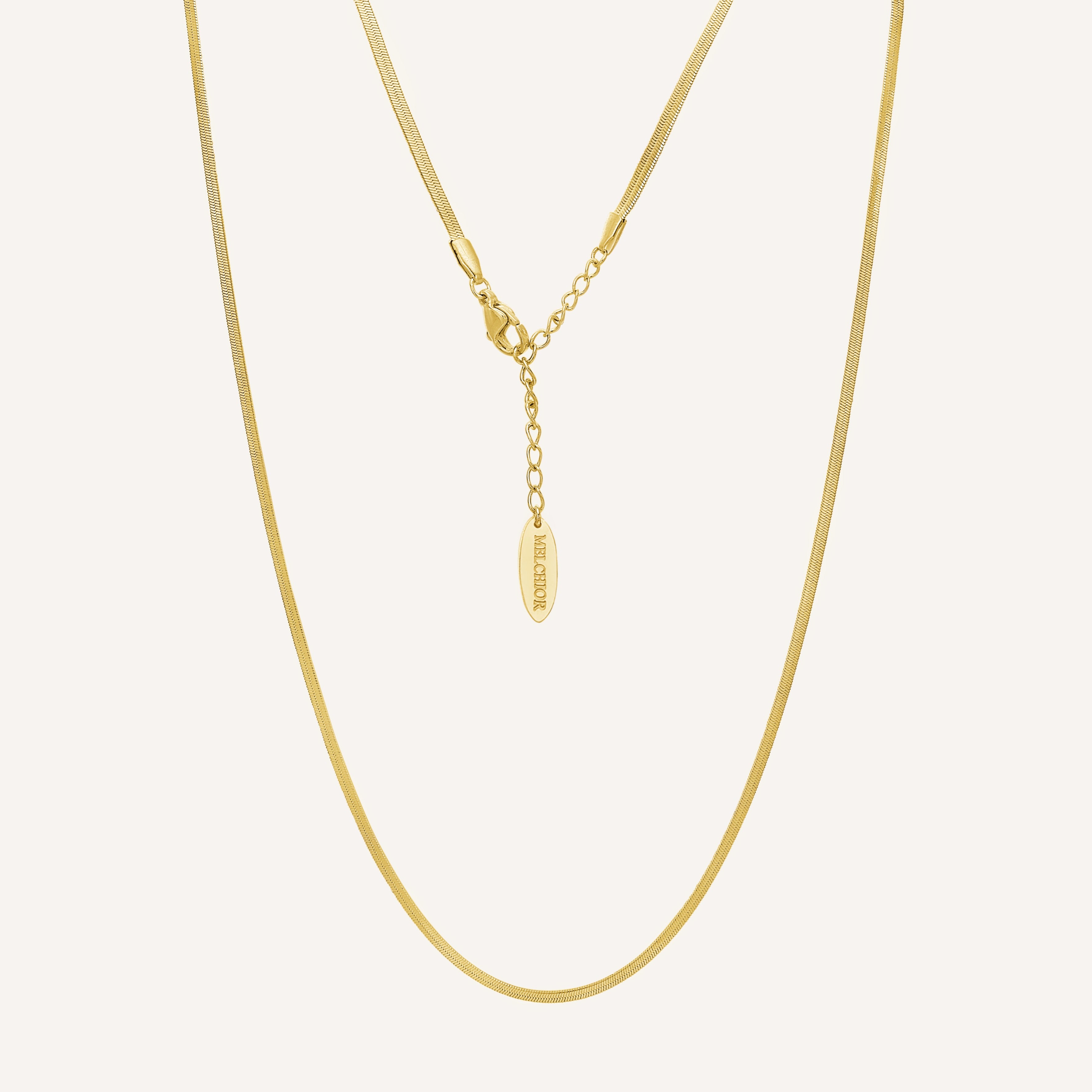 Poleret rustfrit stål, belagt med 18 karat guld + e-coating. Smykkerne er nikkelfri og blyfri, jvf. dansk lovgivning. Smykket kan tåle vand, sved og parfume.