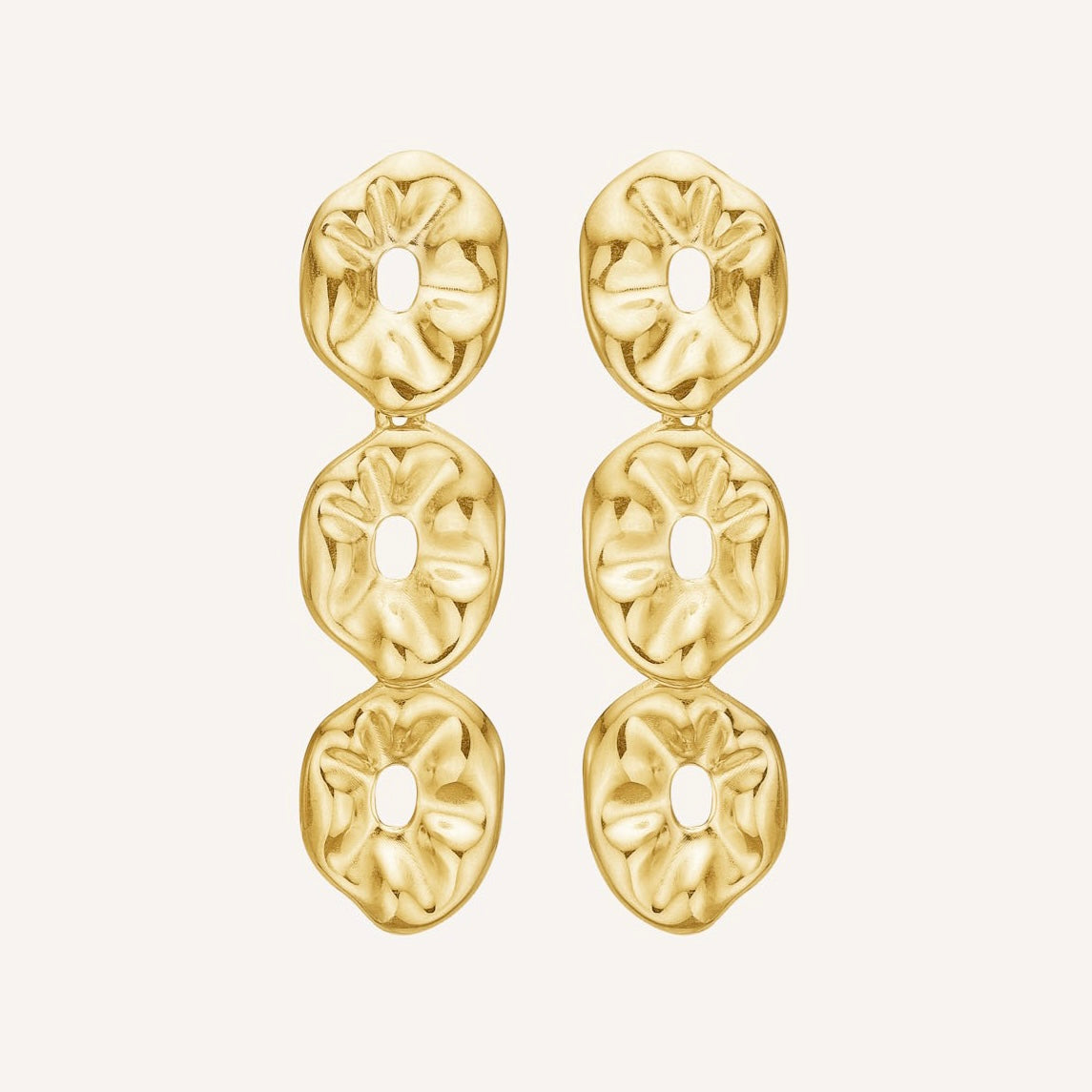 Poleret rustfrit stål, belagt med 18 karat guld + e-coating. Smykkerne er nikkelfri og blyfri, jvf. dansk lovgivning. Smykket kan tåle vand, sved og parfume.