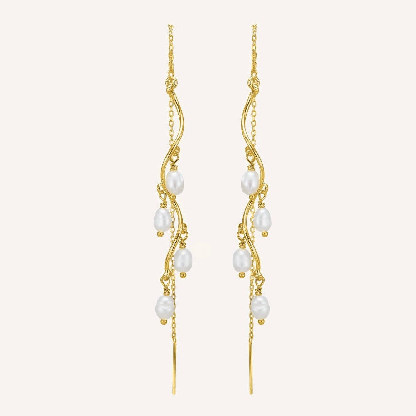 Fortryllende øreringe sat med ægte ferskvandsperler og bølget spiralvedhæng, der snor sig gennem øret og forbinder de to elementer. Øreringene har en twistet profil med en delikat og glansfuld overfladetekstur.