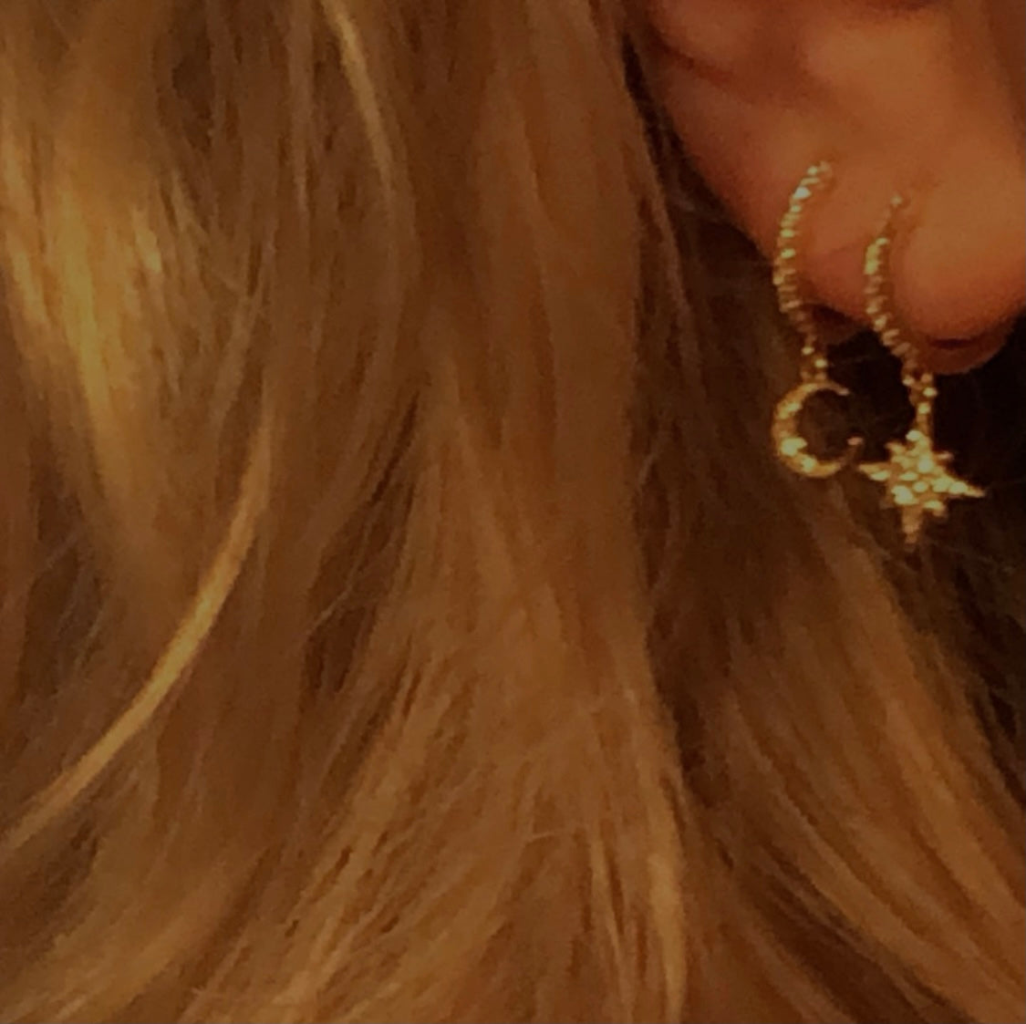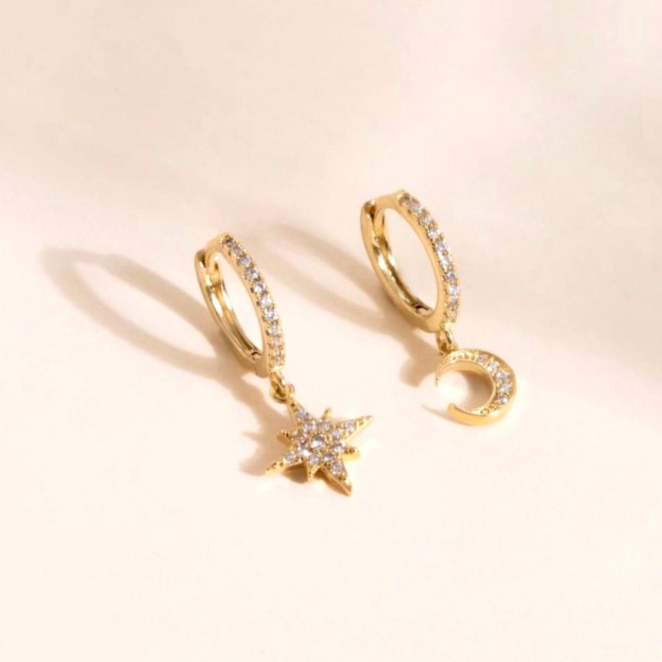 Et smukt design bestående af et måne- og stjernevedhæng. Øreringene er sammensat af funklende zirkonia sten, som giver et feminint og fængende strejf. Ideelle til enhver smykkesamling.