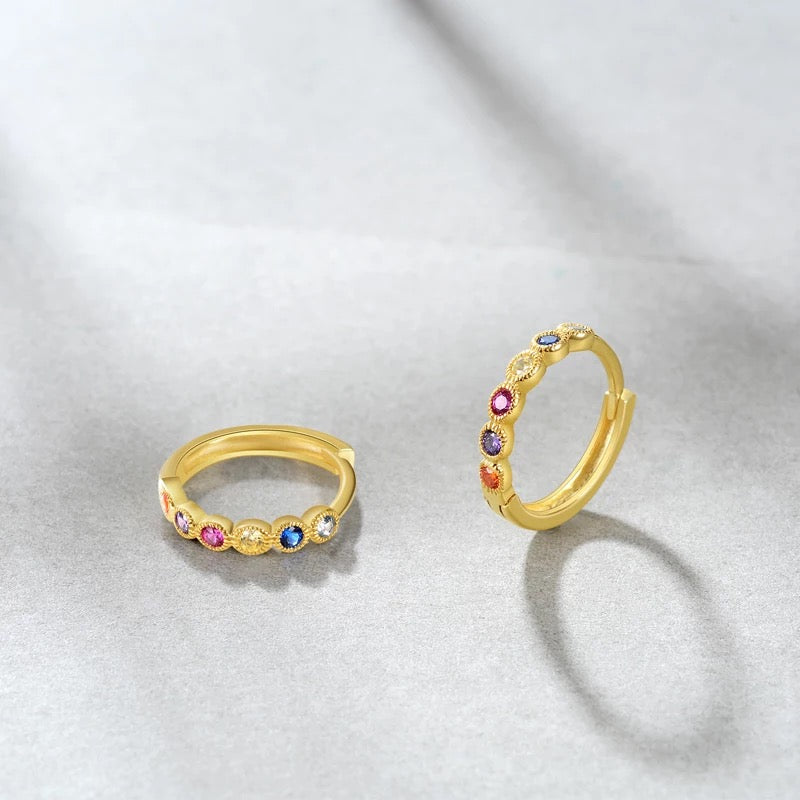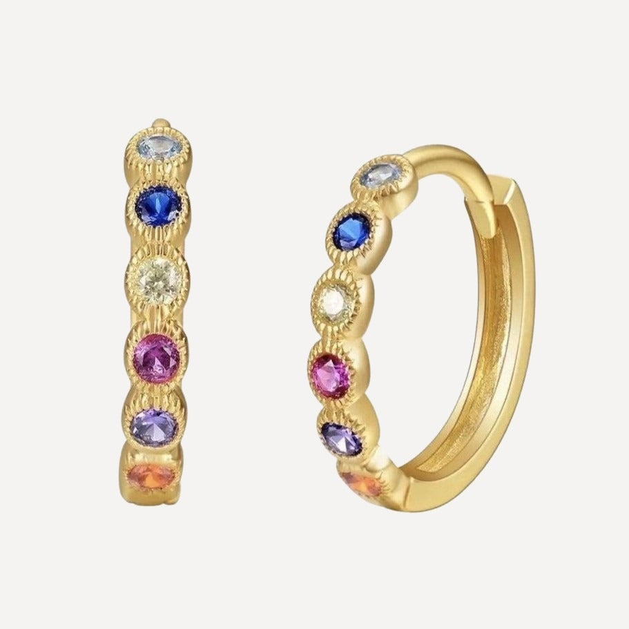 Elegante multicoin hoop øreringe fra multicoin kollektionen. Øreringene er sammensat af smukke facetslebne zirkonia sten i forskellige farver. Feminine og stilfulde i sit udtryk, og flotte i sammensætning med vores multicoin earcuff fra samme kollektion, se her.