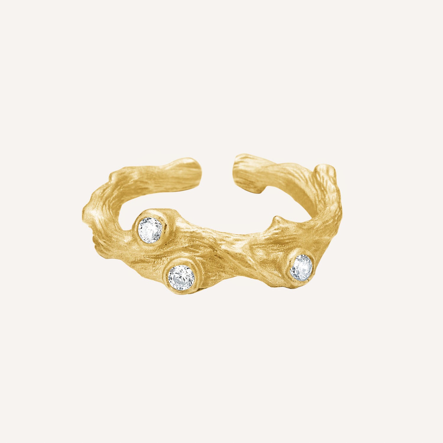 Ringens overflade flyder over fingeren som gyldent lava, der tilfældigt og smukt smelter sig vej gennem landskabet i tykke, organiske bølgebevægelser. I ringens design er indfattet tre funklende zirkoniasten, som giver et delikat og yndefuldt udtryk og komplimenterer den rustikke ringoverflade.