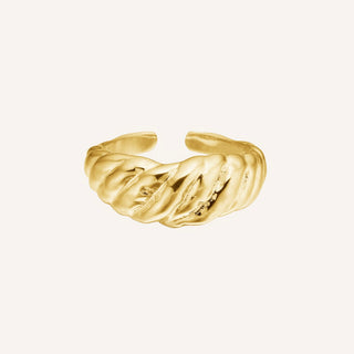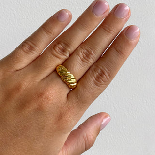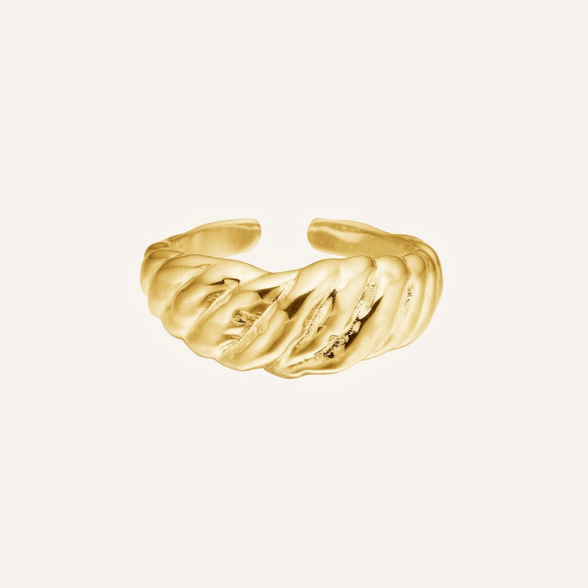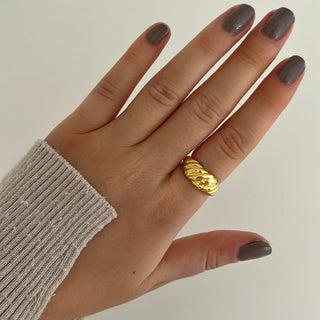 Ringens overflade flyder over fingeren som gyldent lava, der tilfældigt og smukt smelter sig vej gennem et landskab i tykke, organiske bølgebevægelser.