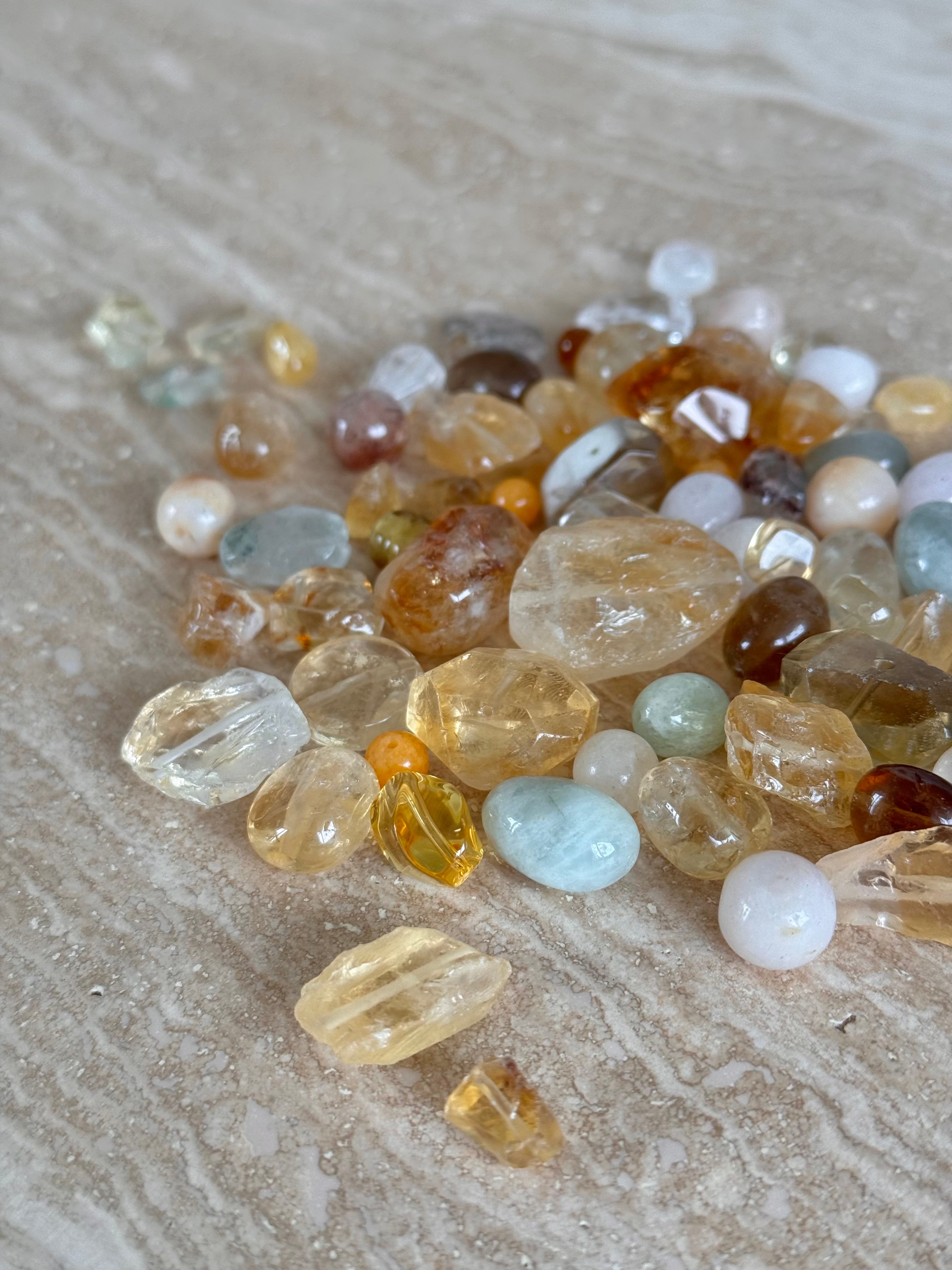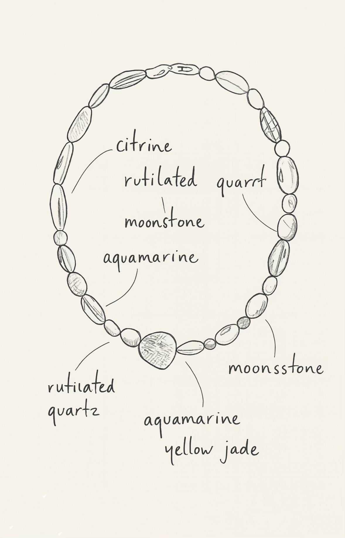Bjergkrystal, Jade rosa, Jade mælkehvid, Aventurin krystal gullig, Glatsleben månesten, Rosenkvarts, Chrysoberyl krystal, Citrin krystal